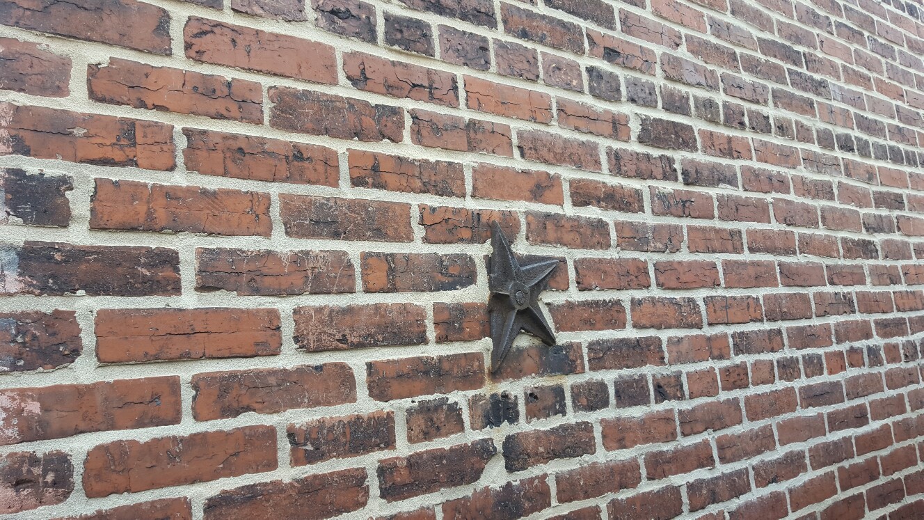 The wall in this photo is built with brick in a Commodore American bond pattern. I noticed there are “Barnstars” installed for prevention of lateral deflection.